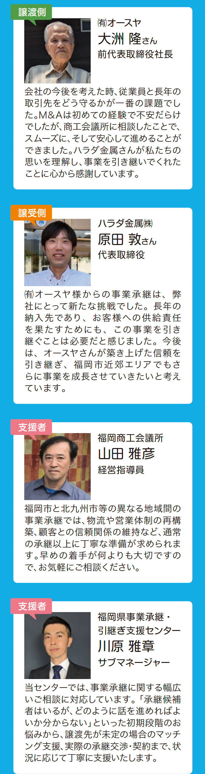 長年の仕入れ先であり、北九州市を主要営業エリアとするハラダ金属(株)へ承継する方向性は決まったものの、具体的な進め方や、事業承継に伴うリスク、留意点など、不明な点ばかりで大きな不安を感じていました。